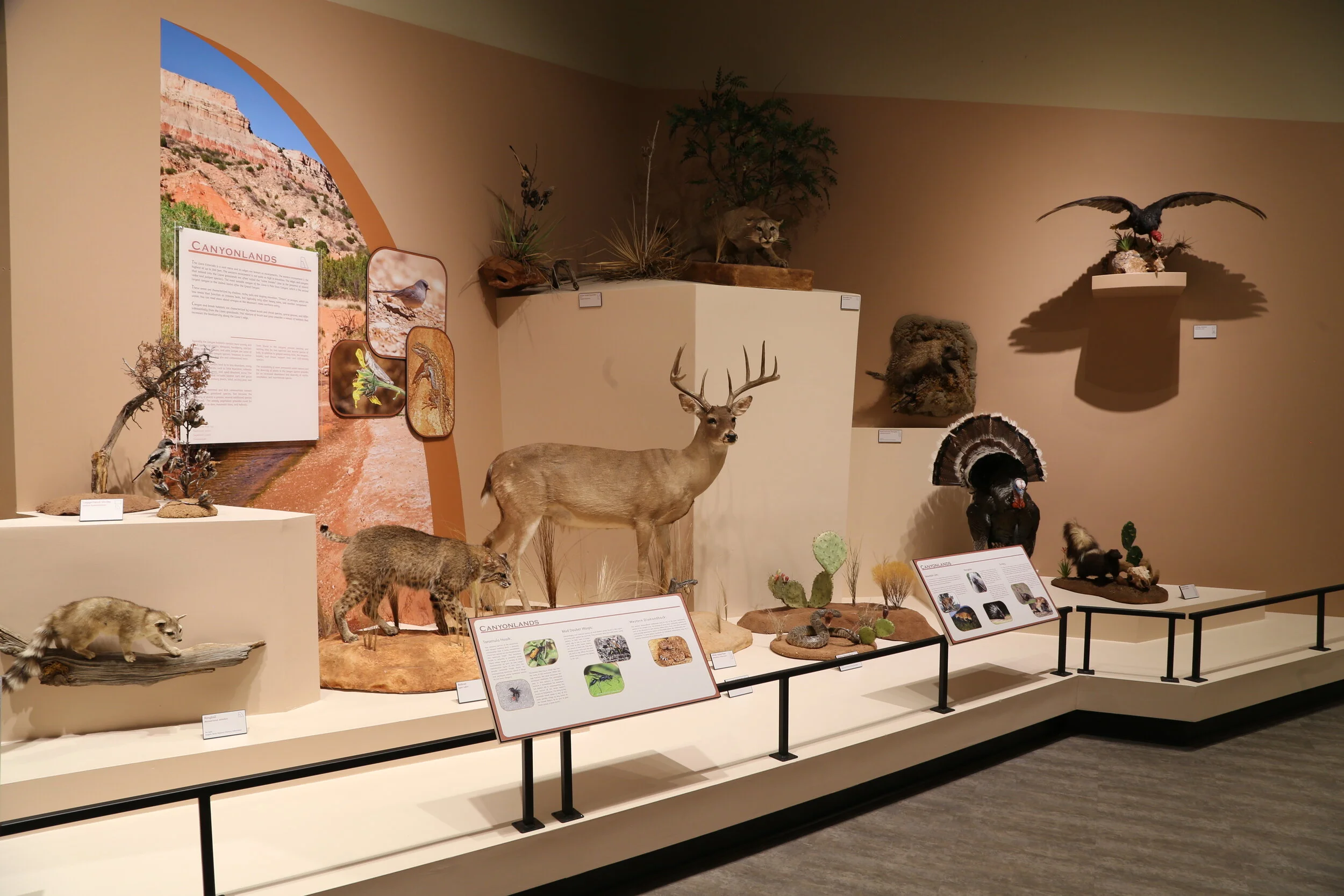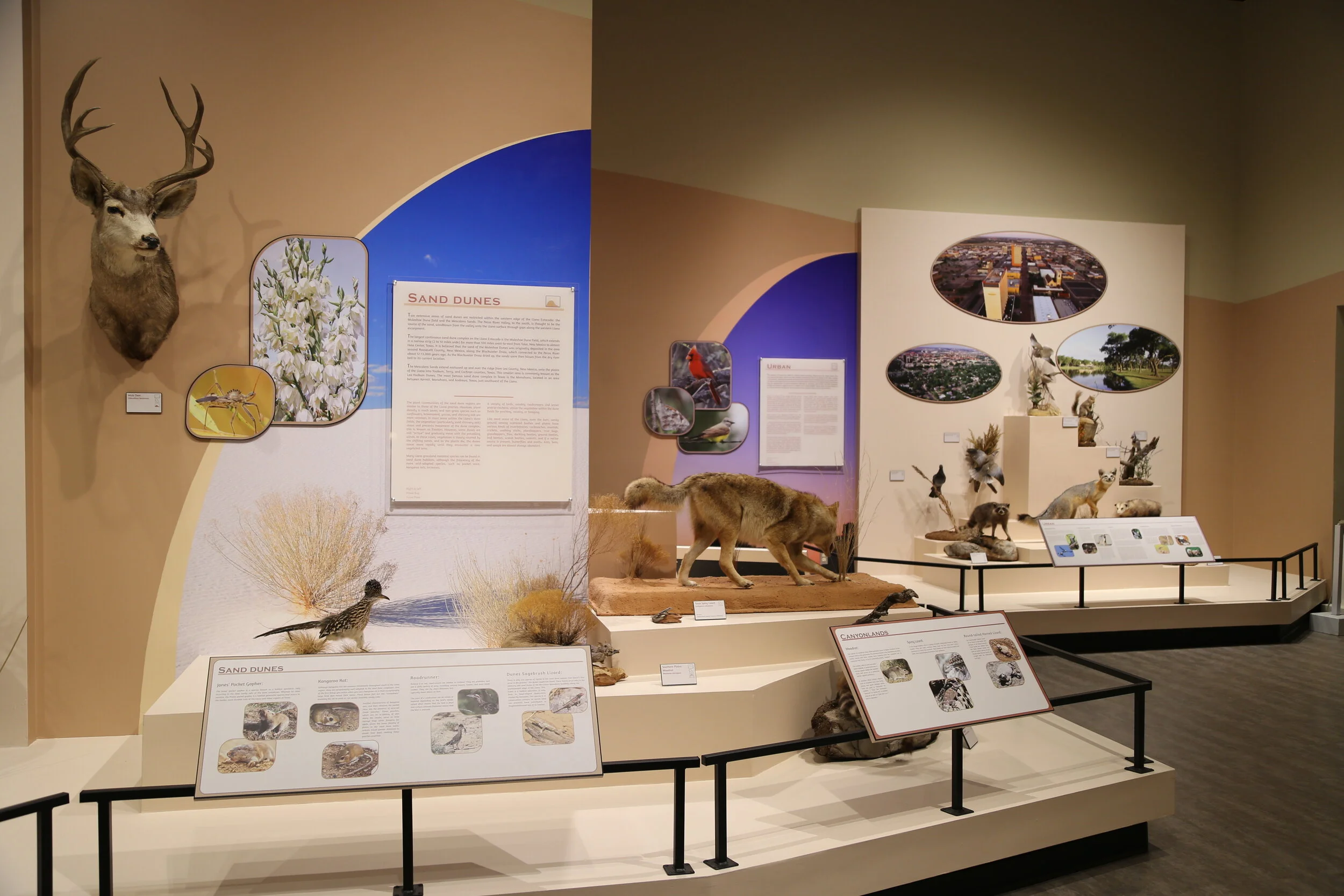 A new permanent exhibit, Biodiversity of the Llano Estacado features an in depth look at this living landscape and explores the importance of biodiversity and the seven major habitats which supports a variety of wildlife. The challenge of this exhibition was to make all the components aesthetically cohesive throughout the seven habitats. I created a customize color palette, based on the color scheme of each habitat in the Llano Estacado: Grasslands and Mixed Prairie, Agriculture, Urban, Salinas, Playas, Sand Dunes, and Canyons. With the use of color, photography, and graphics I was able to created a fluid transition between each habitat, while at the same time emphasizing their differences.